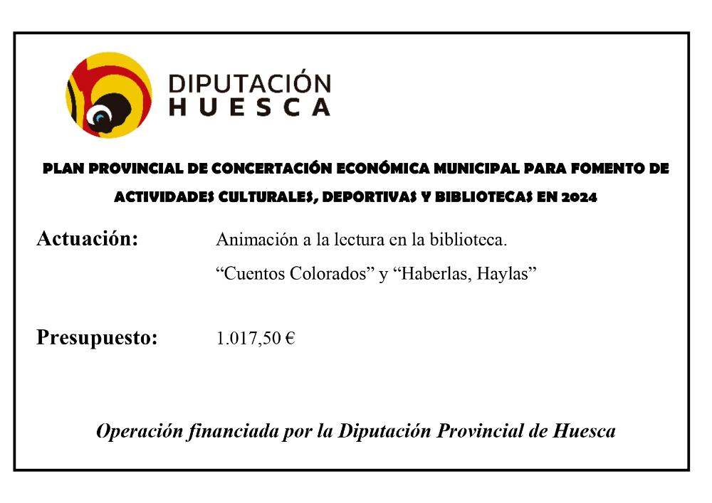 Subvención DPH Plan Provincial Concertación Económica Municipal para fomento de actividades culturales, deportivas y bibliotecas en 2024 Whatsapp: Subvención DPH Plan Provincial Concertación Económica Municipal para fomento de actividades culturales, deportivas y bibliotecas en 2024 Fecha 30 octubre 2024 La Diputación Provincial de Huesca ha concedido una subvención al Ayuntamiento de Robres para actividades de animación a la lectura, y se han realizado dos cuentacuentos "Cuentos Colorados" y "Haberlas, Haylas" Galería imágenes