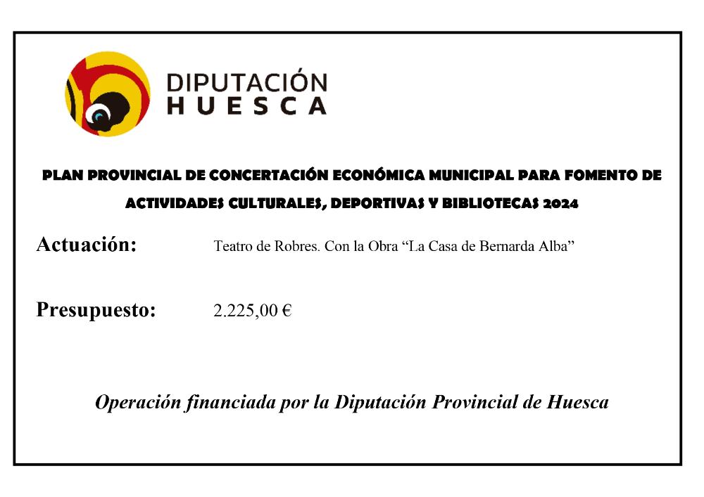 Subvención DPH Plan Provincial Concertación Municipal para fomento de actividades culturales, deportivas y bibliotecas en 2024 Whatsapp: Subvención DPH Plan Provincial Concertación Municipal para fomento de actividades culturales, deportivas y bibliotecas en 2024 Fecha 23 octubre 2024 La Diputación Provincial de Huesca ha subvencionado la Obra "La Casa de Bernarda Alba" interpretada por el Teatro de Robres Galería imágenes